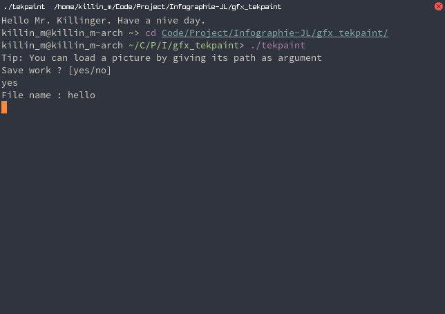 Le TekPaint a pour but de recréer un logiciel de dessin, avec comme fonctionnalités, la possibilité de dessiner, de créer des formes (carrés, ronds, ...), l'enregistrement au format bitmap, ainsi que le chargement au même format, le pot de peinture, la gomme, et le choix des couleurs.